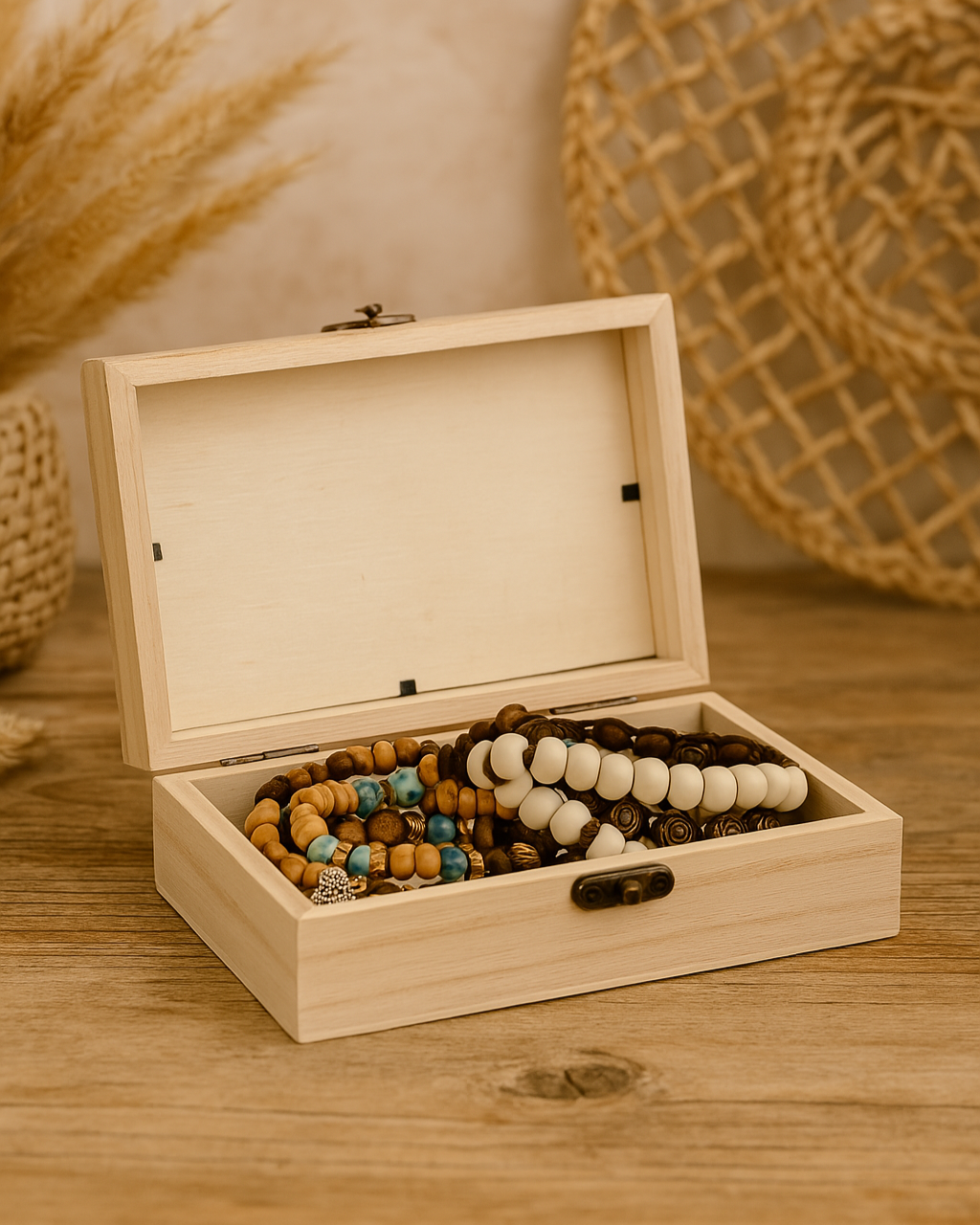 A rustic wooden box filled with 10 unique handmade bead bracelets in calming natural tones — wood, shell, and ceramic textures that radiate peaceful, free-spirited vibes.