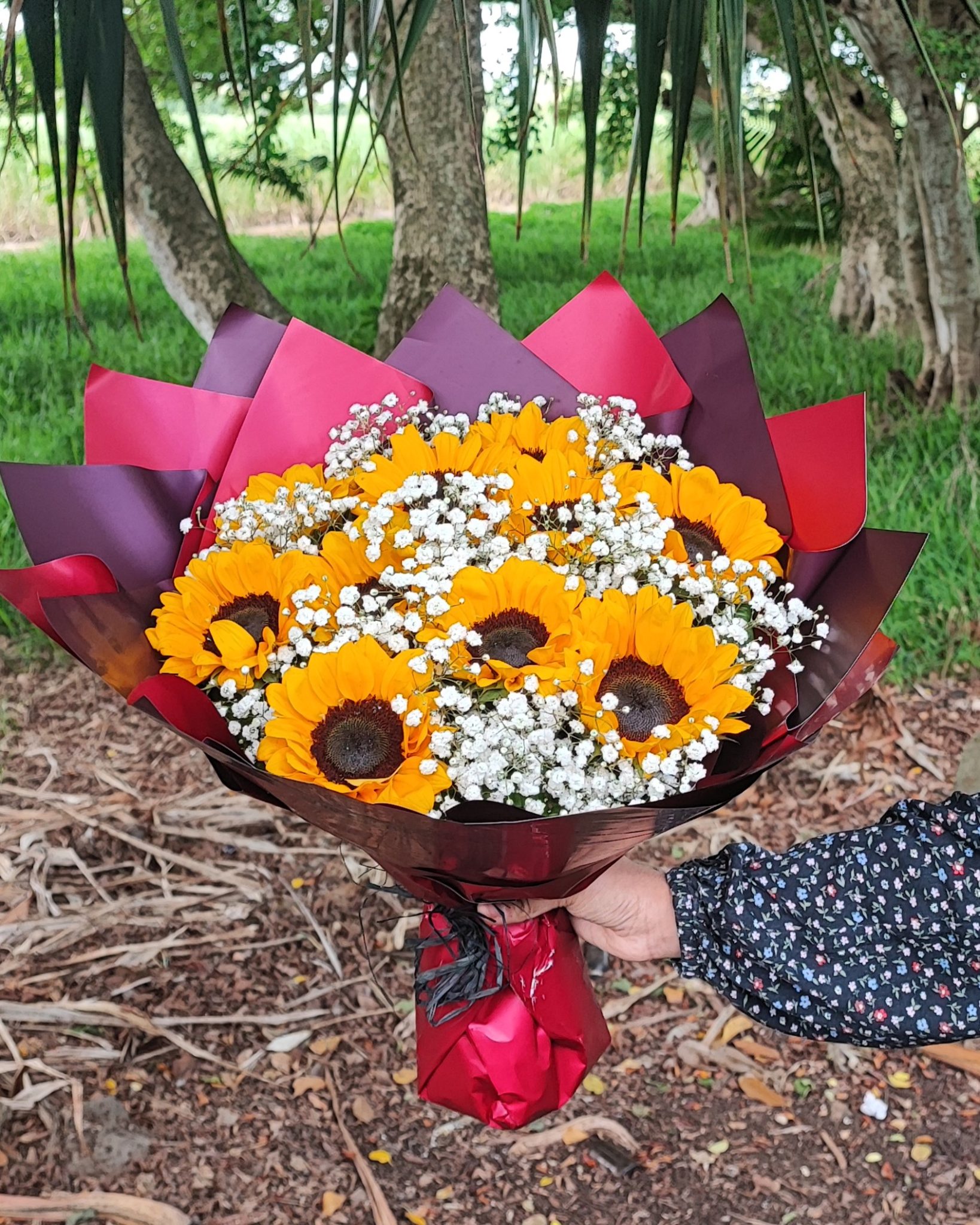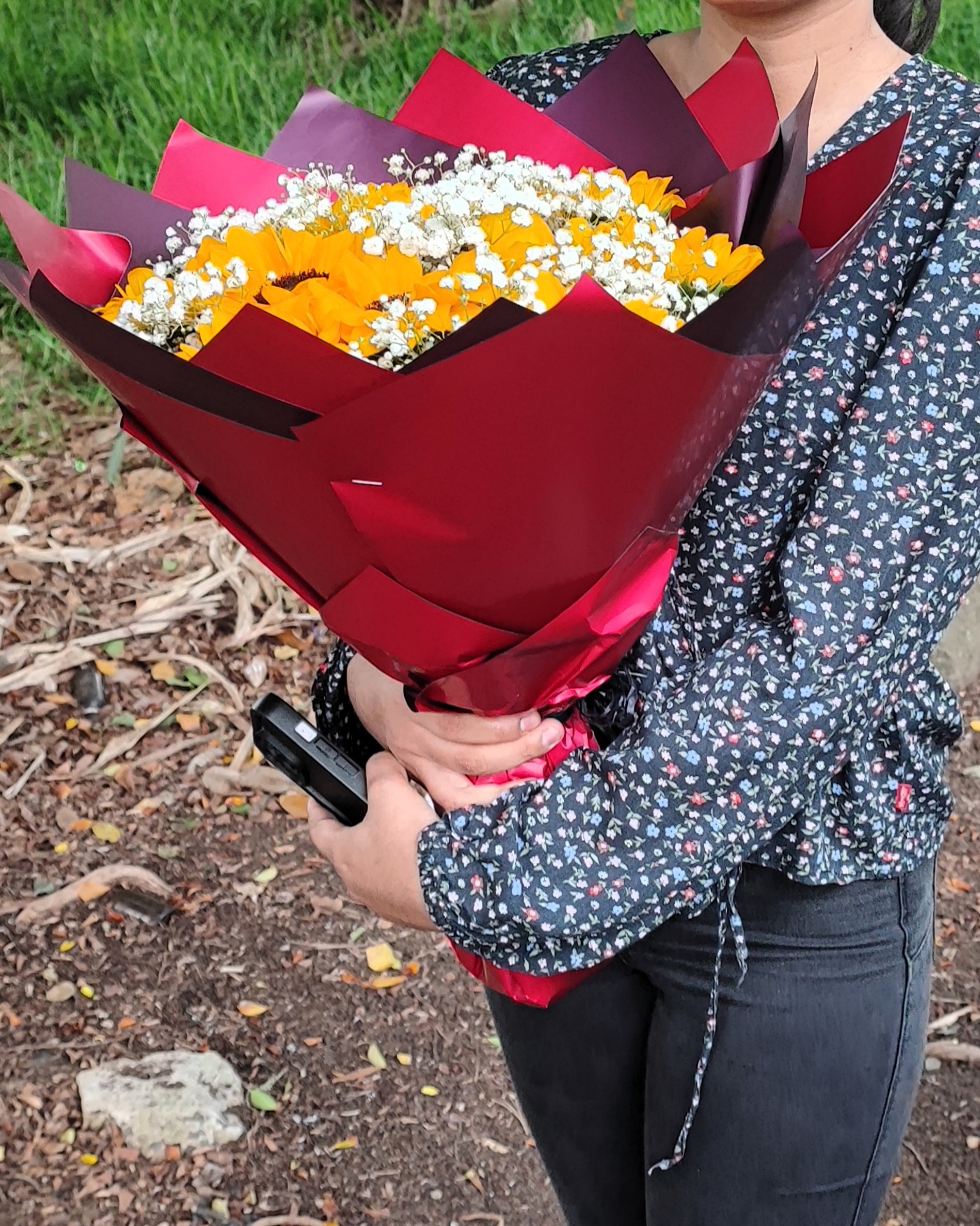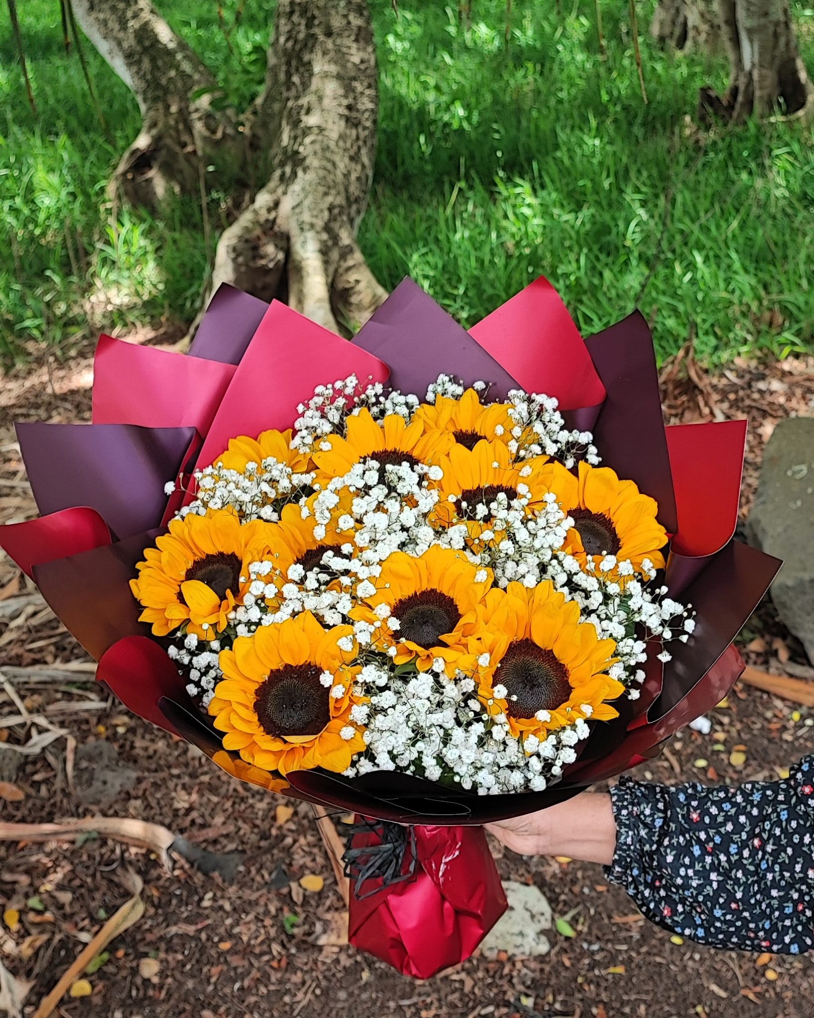 Radiating warmth, positivity, and strength, this vibrant bouquet of approximately 8 to 10 fresh sunflowers is an instant mood-lifter. Surrounded by delicate baby’s-breath and wrapped in deep red and wine-toned paper, this bouquet is bold, beautiful, and impossible to ignore.