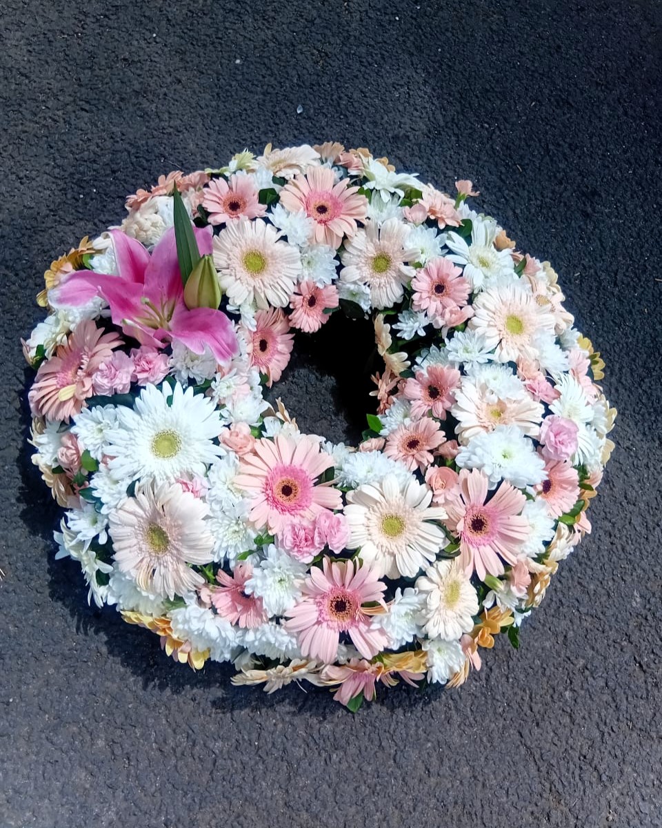 Convey gentle compassion, thoughtful reflection, and heartfelt warmth with the Grand Circle of Grace (approx. 80cm diameter) arrangement. Carefully crafted with soft pink roses and delicate pastel gerberas paired harmoniously with serene white chrysanthemums, this circular arrangement symbolizes eternal care and sincere affection. Ideal for sending respectful condolences or messages of quiet support and encouragement during moments that call for thoughtful gestures. Note: The colors of the flowers might differ depending on availability of flowers, but they will be of pastel colors range.