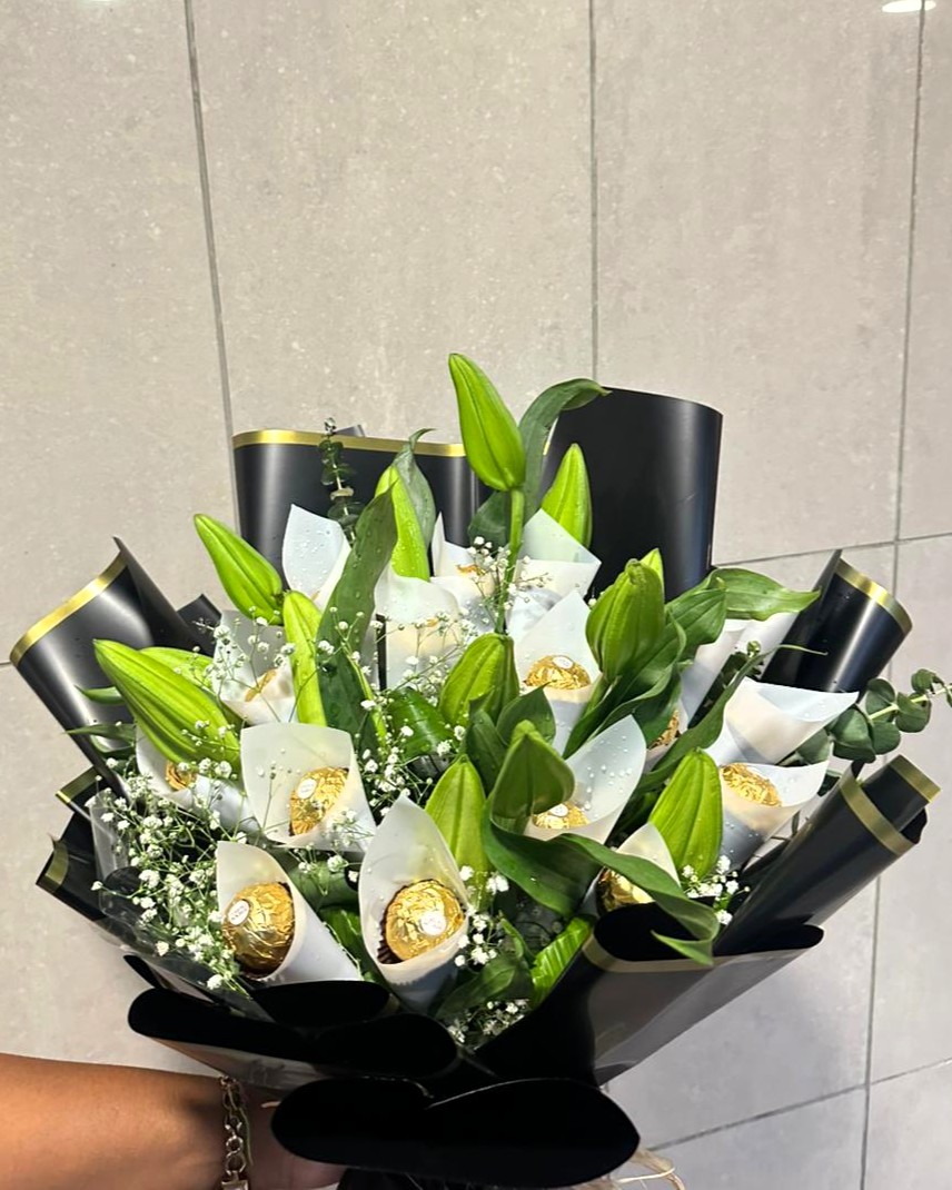 A bouquet that exudes pure sophistication – this stunning arrangement blends the timeless elegance of fresh white lilies with the golden indulgence of Ferrero Rocher chocolates. Beautifully wrapped in dramatic black or royal blue tones (wrapping will depend on availability), it’s a gift that captures both beauty and taste in one luxurious presentation.