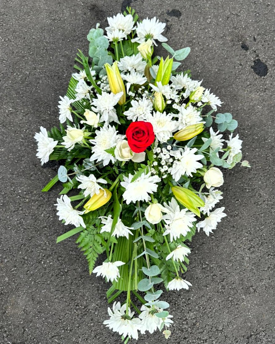 A deeply symbolic tribute where purity meets a single, unforgettable memory. Surrounded by soft white blooms, the solitary red rose stands as a powerful reminder of a love, a life, or a presence that will always stand apart. Crafted in a graceful elongated form, this arrangement speaks quietly yet profoundly. It is designed for moments of farewell, remembrance, and honor, where one soul remains forever distinct in the hearts of many.