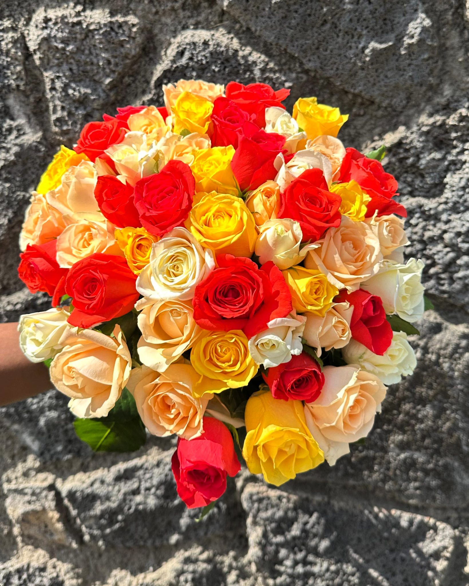 A radiant celebration of color and emotion, this captivating bouquet blends vibrant and soft-toned roses into a stunning harmony that feels like golden hour in full bloom. Each rose is carefully selected to create a lively yet elegant composition that instantly draws attention and uplifts the mood.