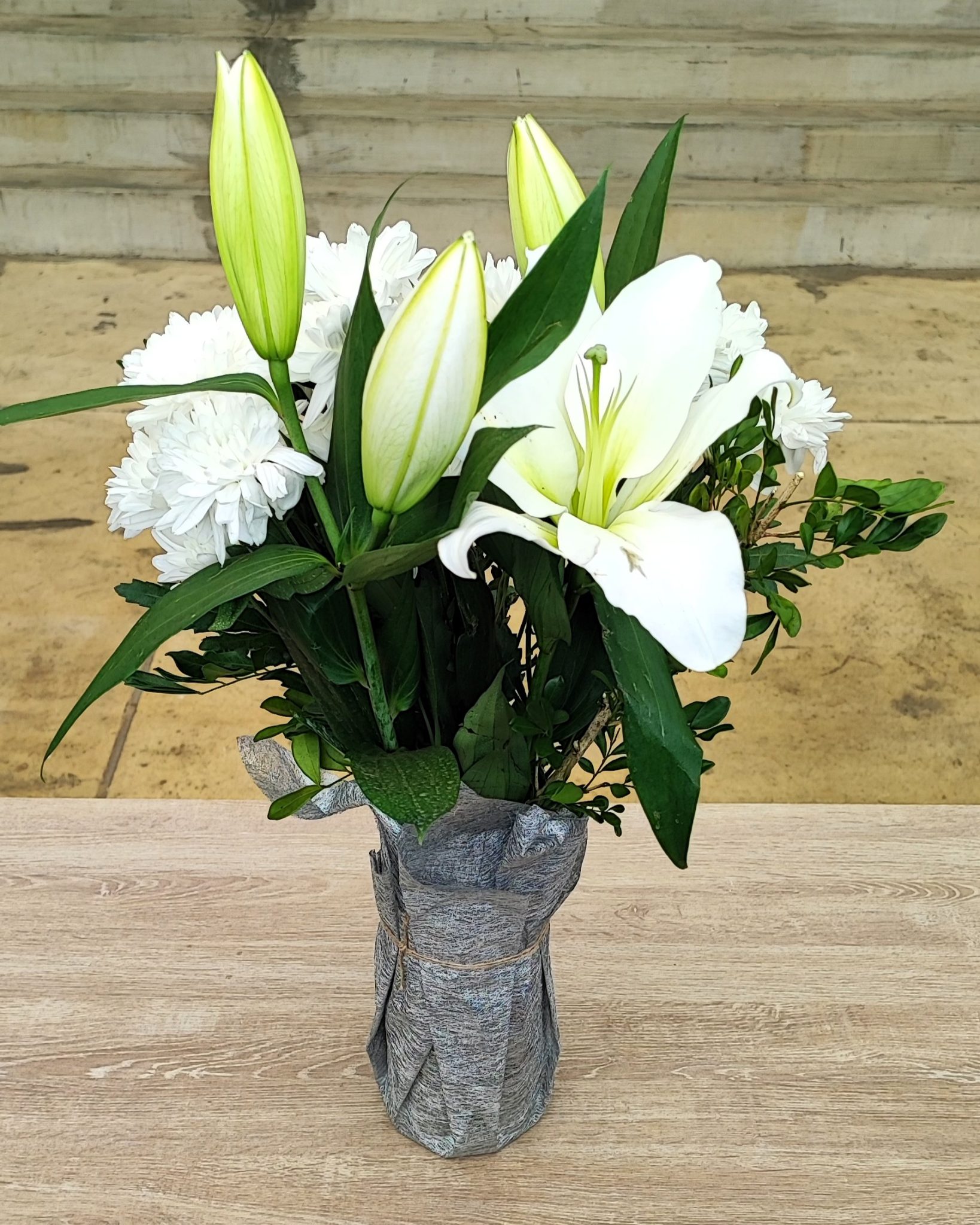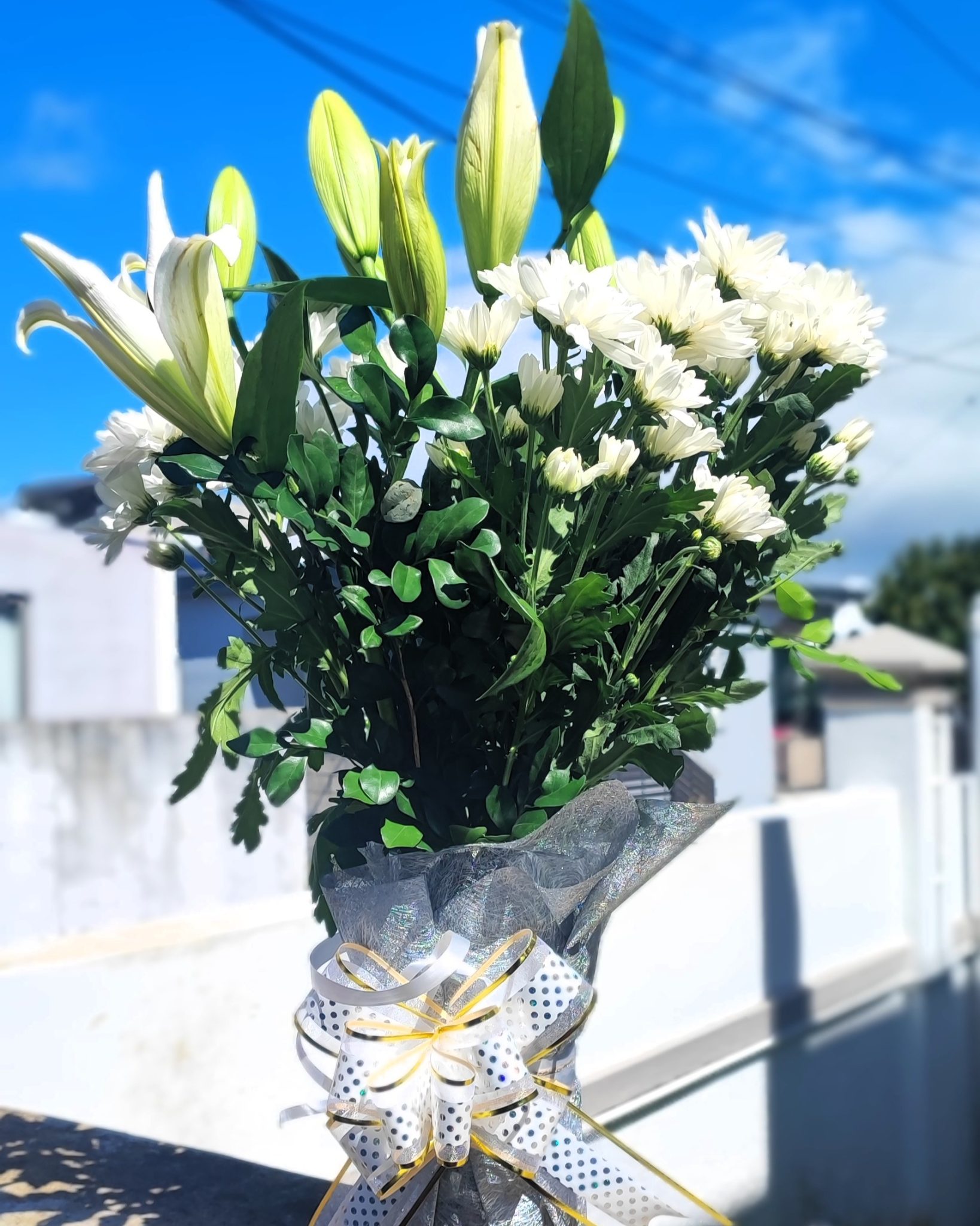 Elegant white lilies and white chrysanthemums