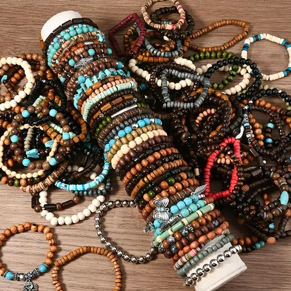 A wooden box, containing 10 different handmade bohemian bracelets of beads. The perfect gift for for man and woman. The bracelets are unisex.